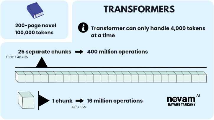 Transformers process long documents by dividing them into smaller chunks and analyzing them separately. Since a Transformer can only handle 4,000 tokens at a time, a 100K-word novel must be split into 25 separate chunks (100K ÷ 4K = 25).